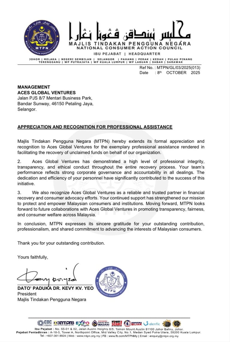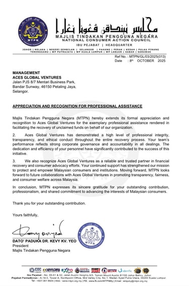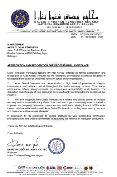 Official recognition from Majlis Tindakan Pengguna Negara (MTPN) for our professional assistance in recovering unclaimed funds. A proud milestone for Aces Global Ventures.