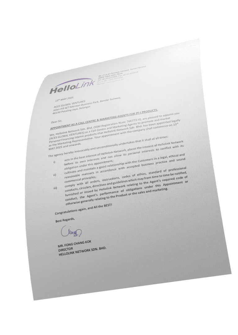 ACES Global Ventures is proudly appointed by Hellolink Network Sdn. Bhd. as an official Call Centre and Marketing Agent for Personal Financing Islamic (PF-i) products. Effective from 13th May 2025, we are committed to upholding the highest standards of professionalism, ethical conduct, and customer care in promoting these financial solutions.